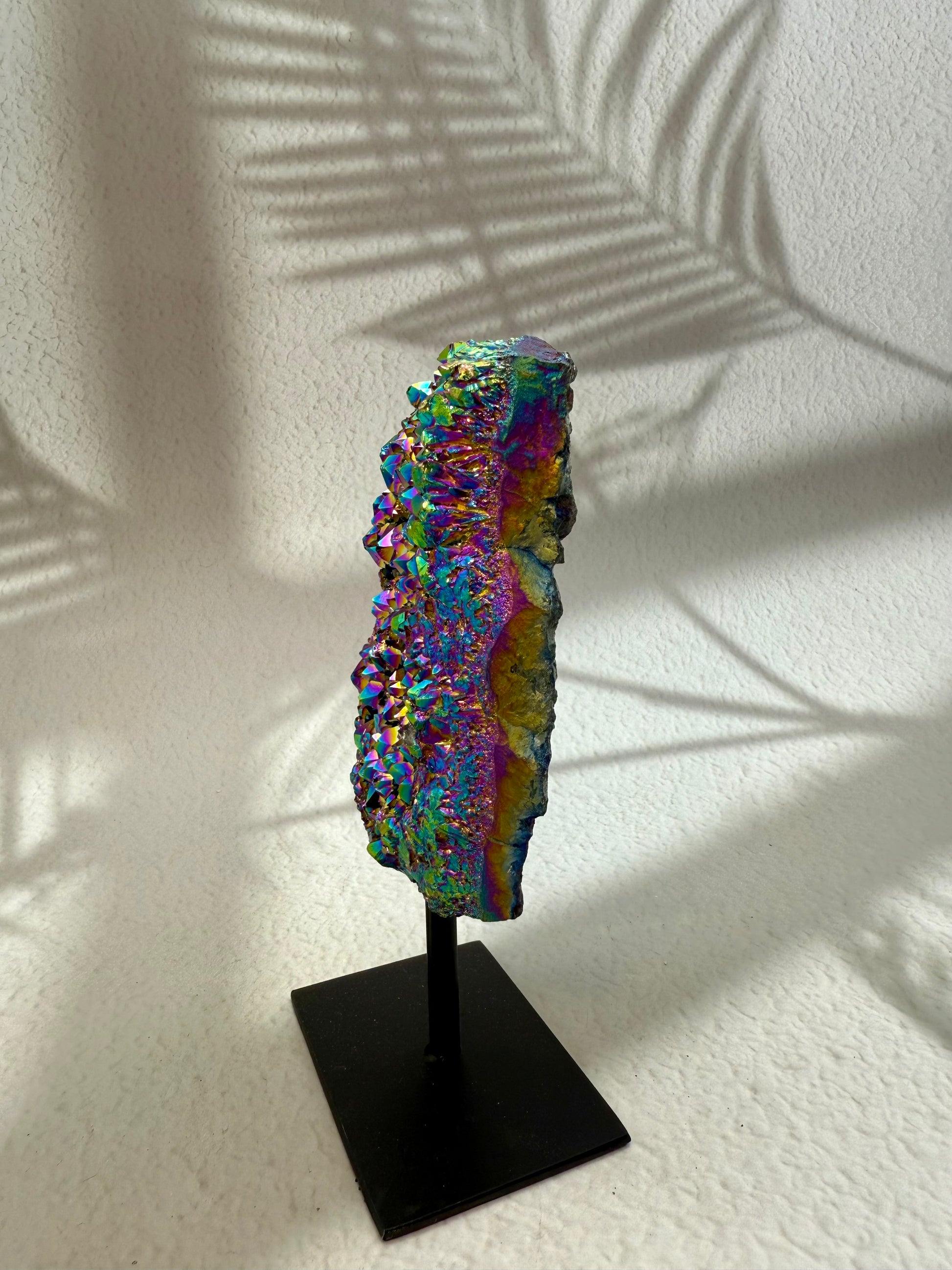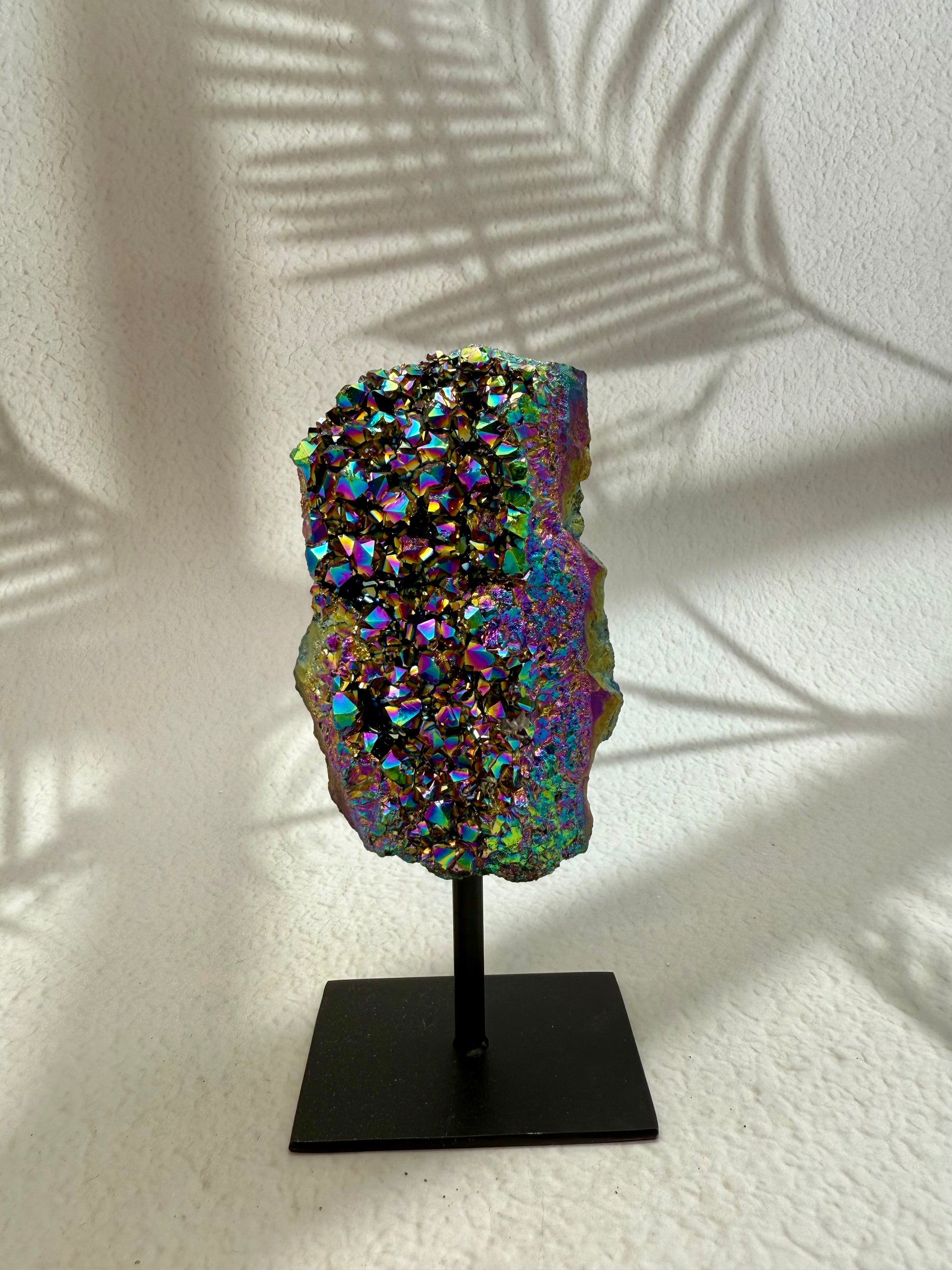 Dieser strahlende Titaniumquarz auf einem eleganten Metallständer vereint natürliche Kristallkraft mit stilvoller Präsentation. Die funkelnden Oberflächen in Blau-, Violett- und Regenbogentönen ziehen alle Blicke auf sich und machen den Quarz zu einem beeindruckenden Blickfang. Auf dem Ständer präsentiert, wird er zu einem dekorativen Highlight und zugleich zu einem kraftvollen Energiespender für dein Zuhause oder deinen Arbeitsplatz.