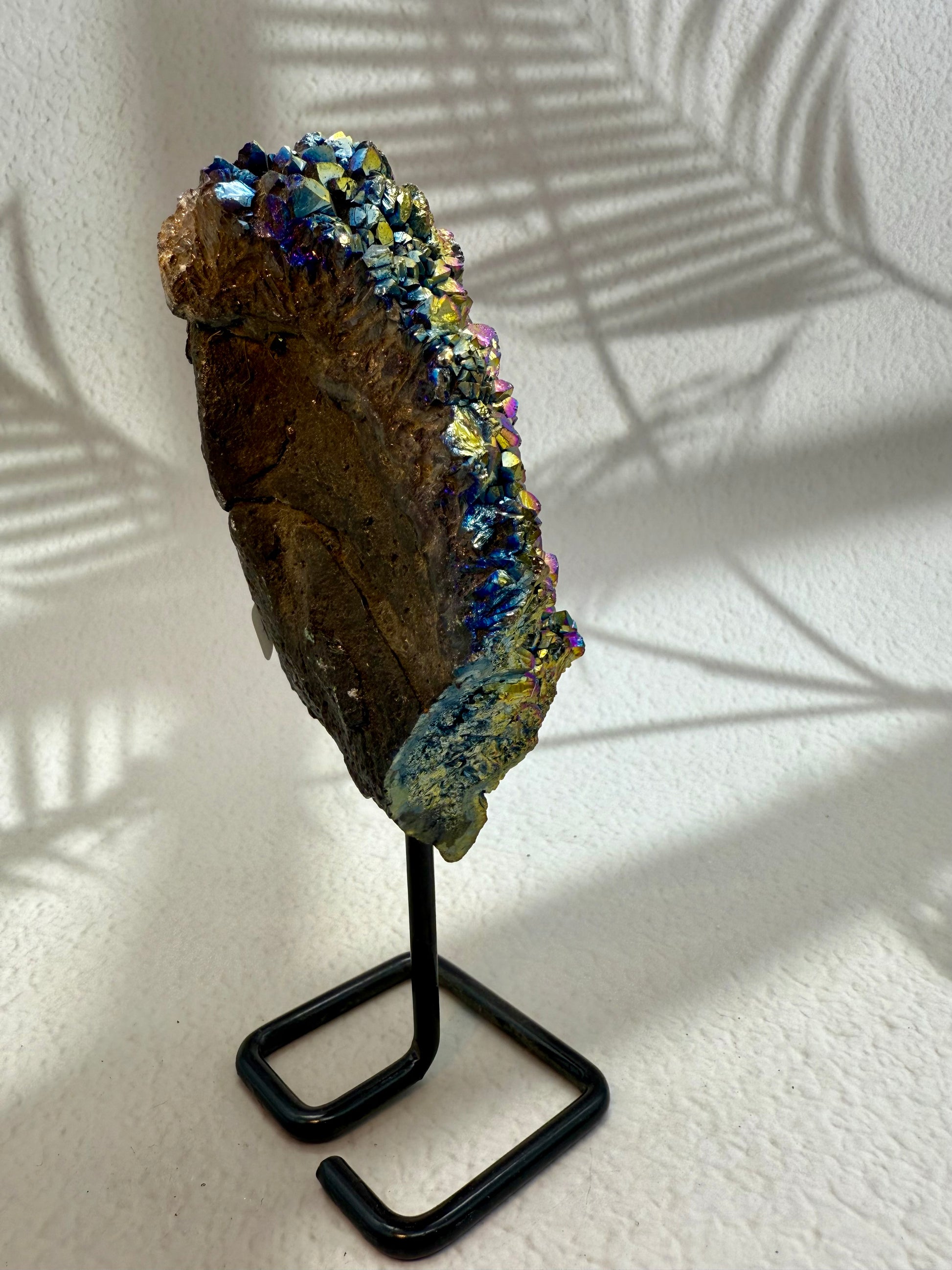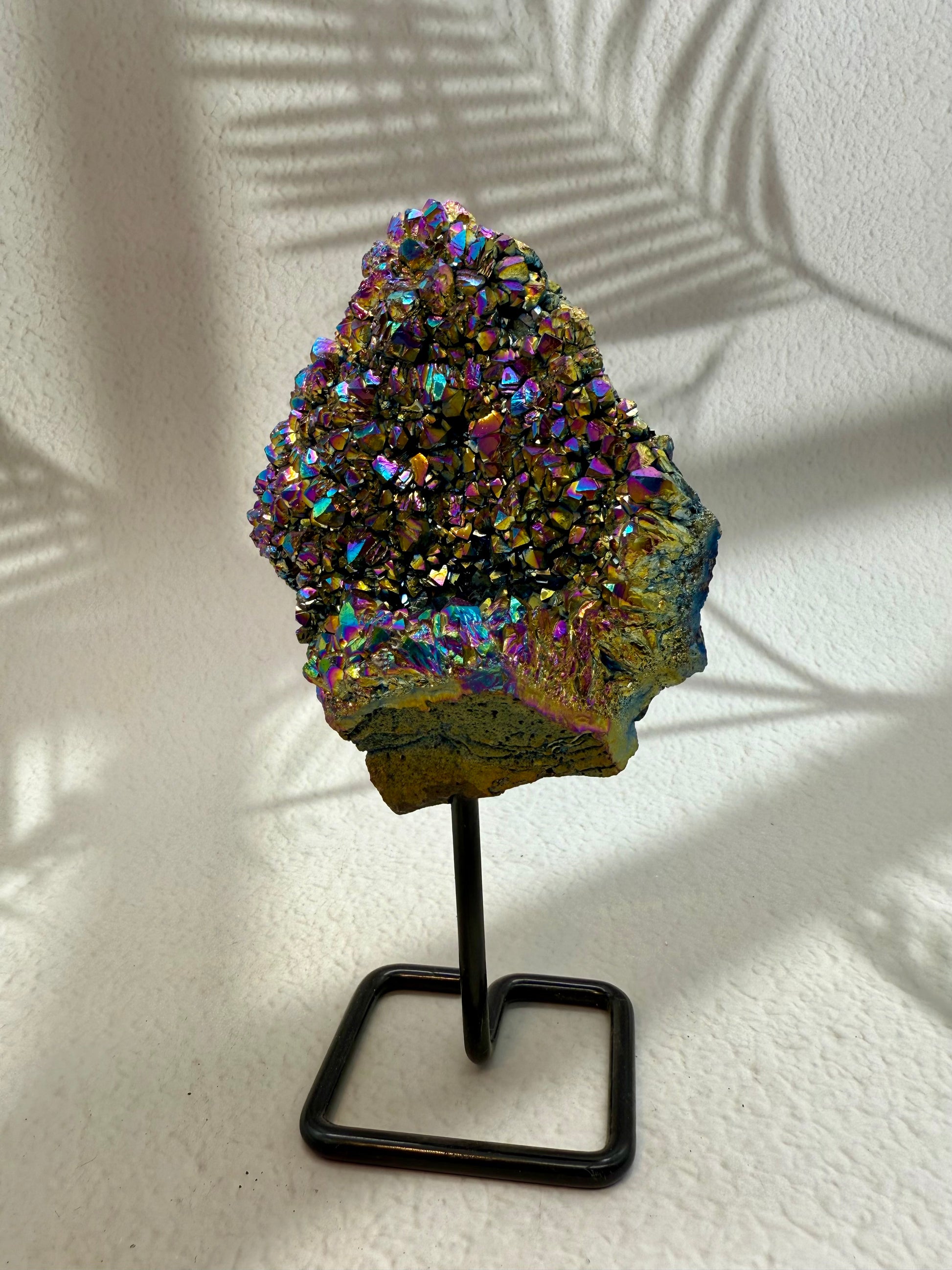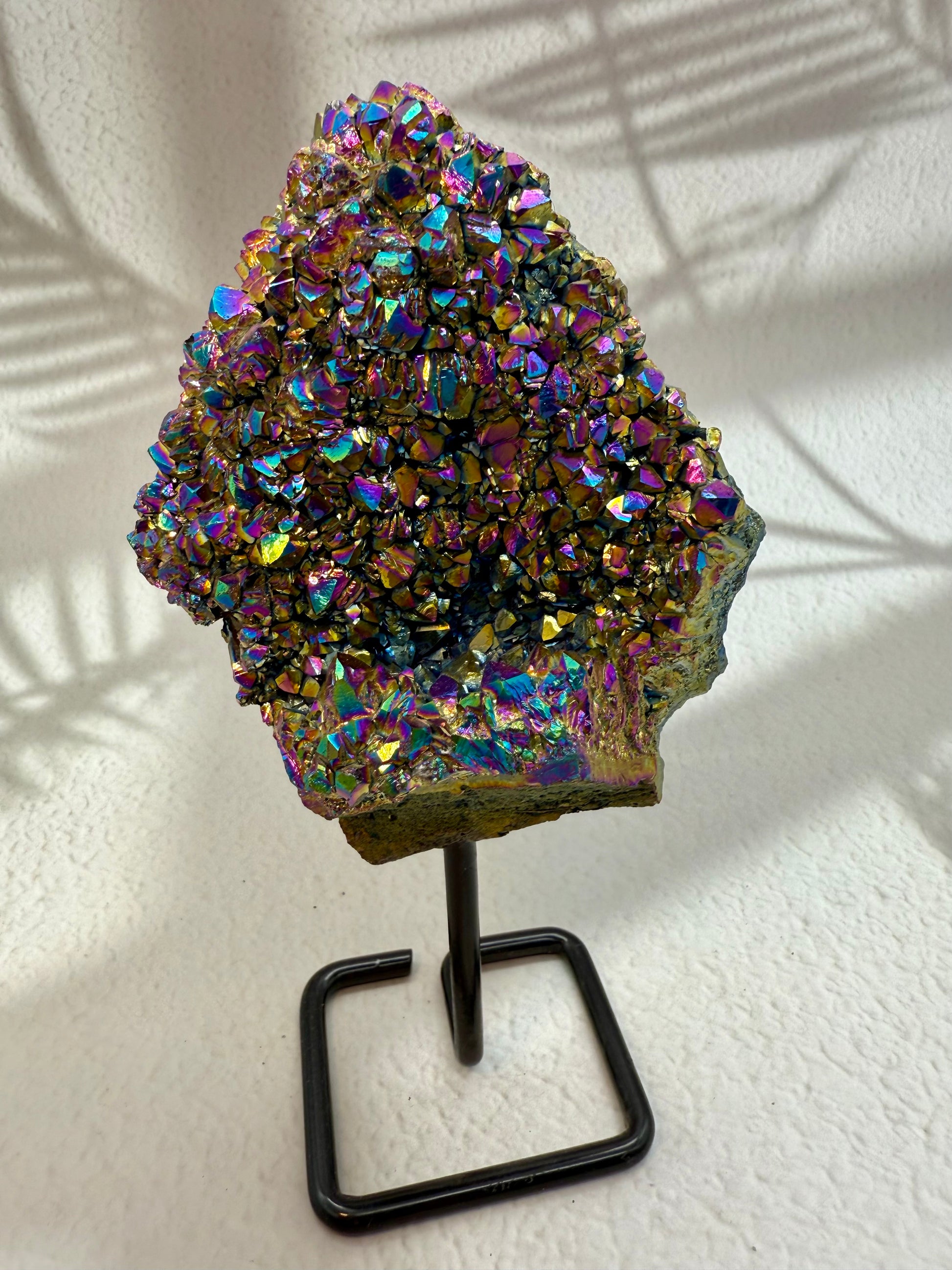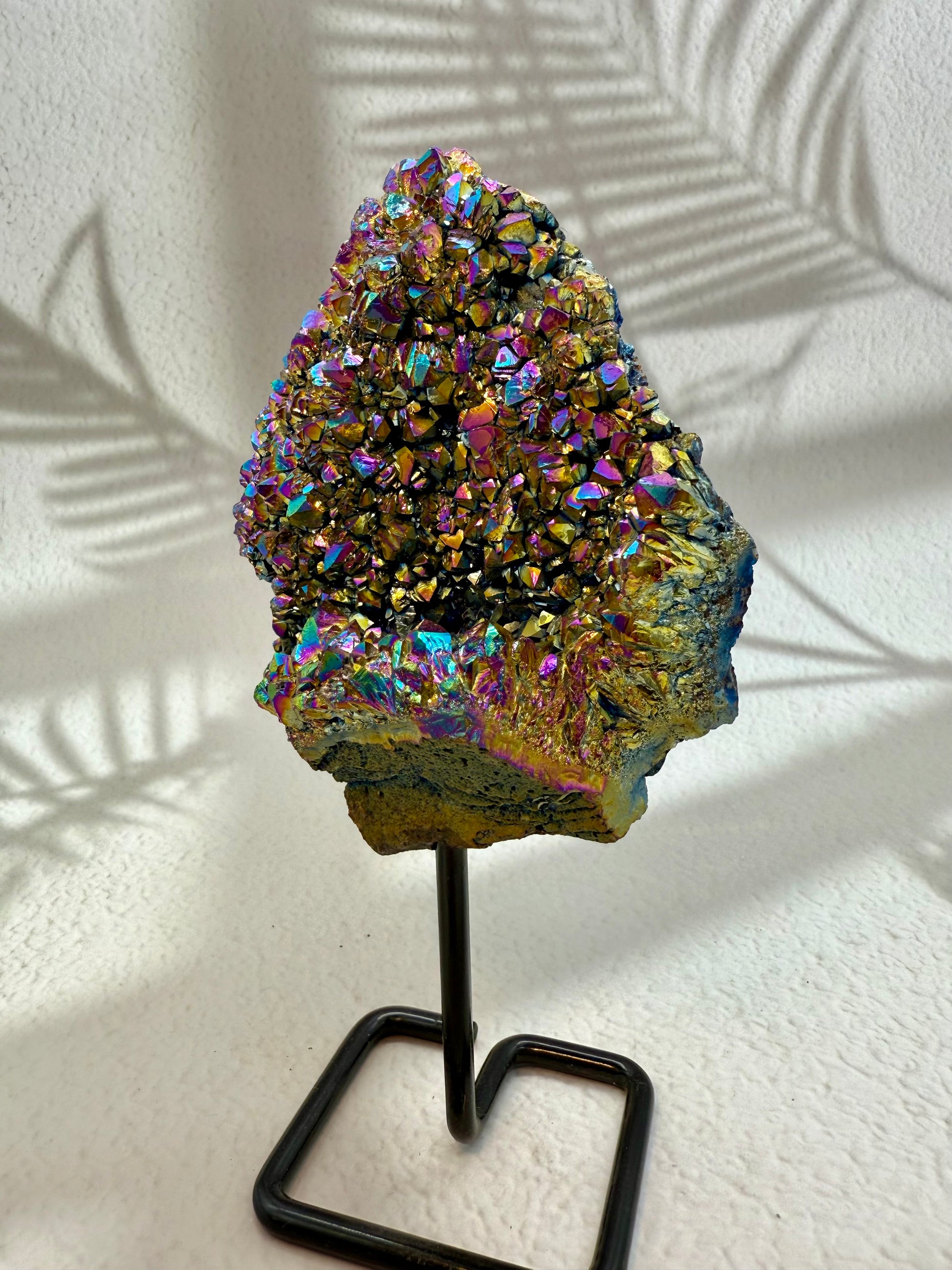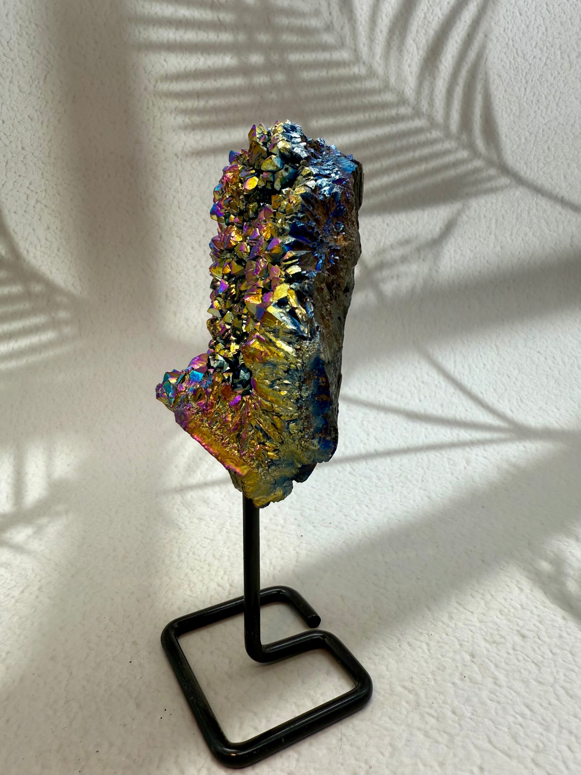 Dieser strahlende Titaniumquarz auf einem eleganten Metallständer vereint natürliche Kristallkraft mit stilvoller Präsentation. Die funkelnden Oberflächen in Blau-, Violett- und Regenbogentönen ziehen alle Blicke auf sich und machen den Quarz zu einem beeindruckenden Blickfang. Auf dem Ständer präsentiert, wird er zu einem dekorativen Highlight und zugleich zu einem kraftvollen Energiespender für dein Zuhause oder deinen Arbeitsplatz.