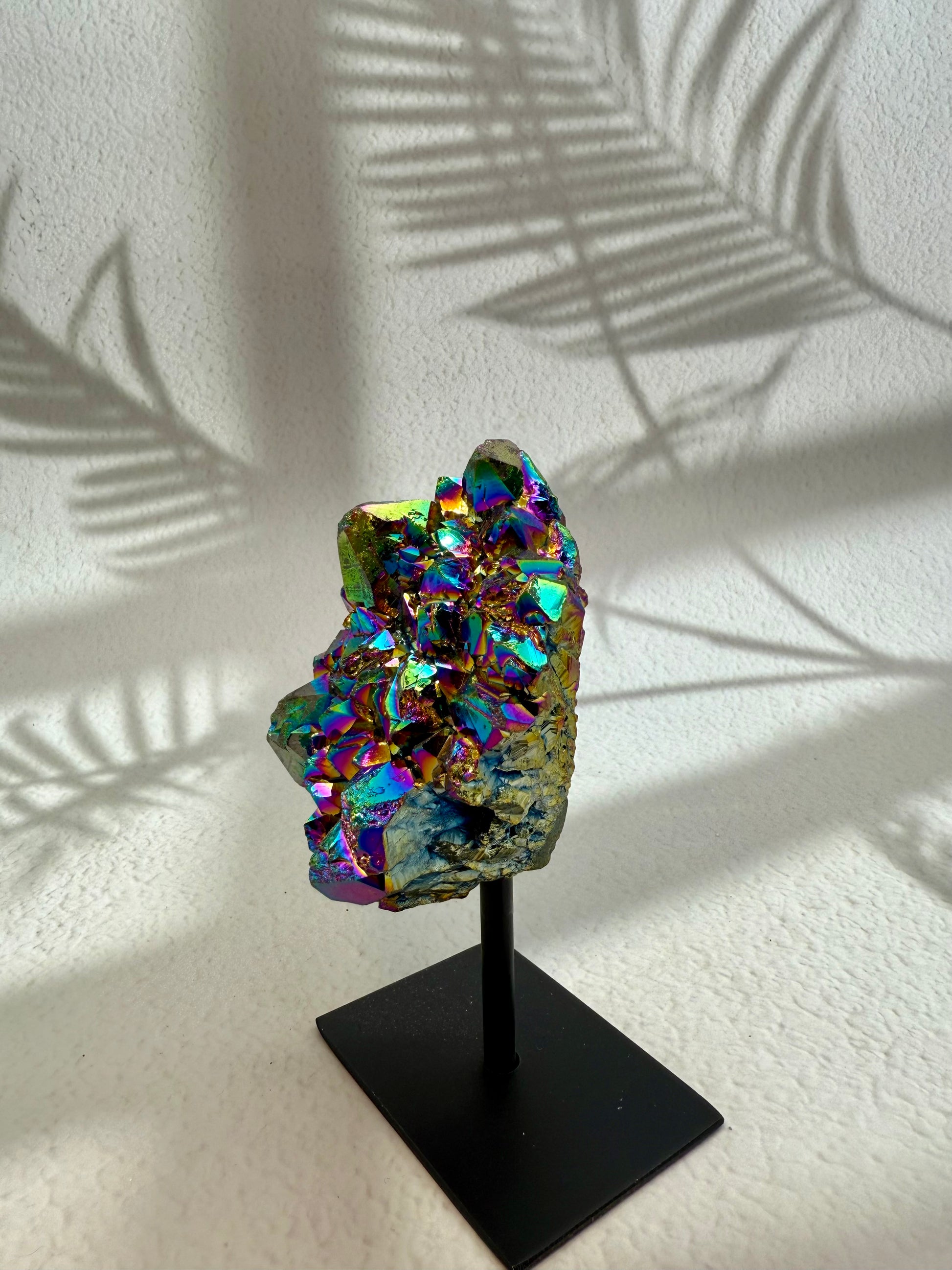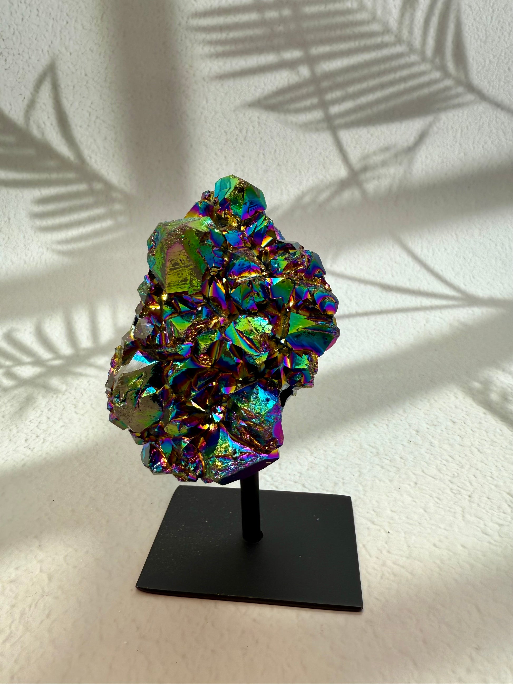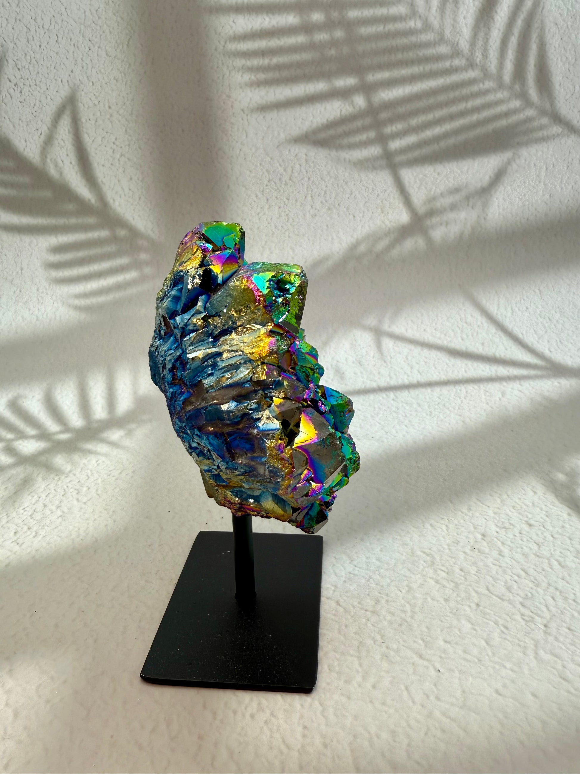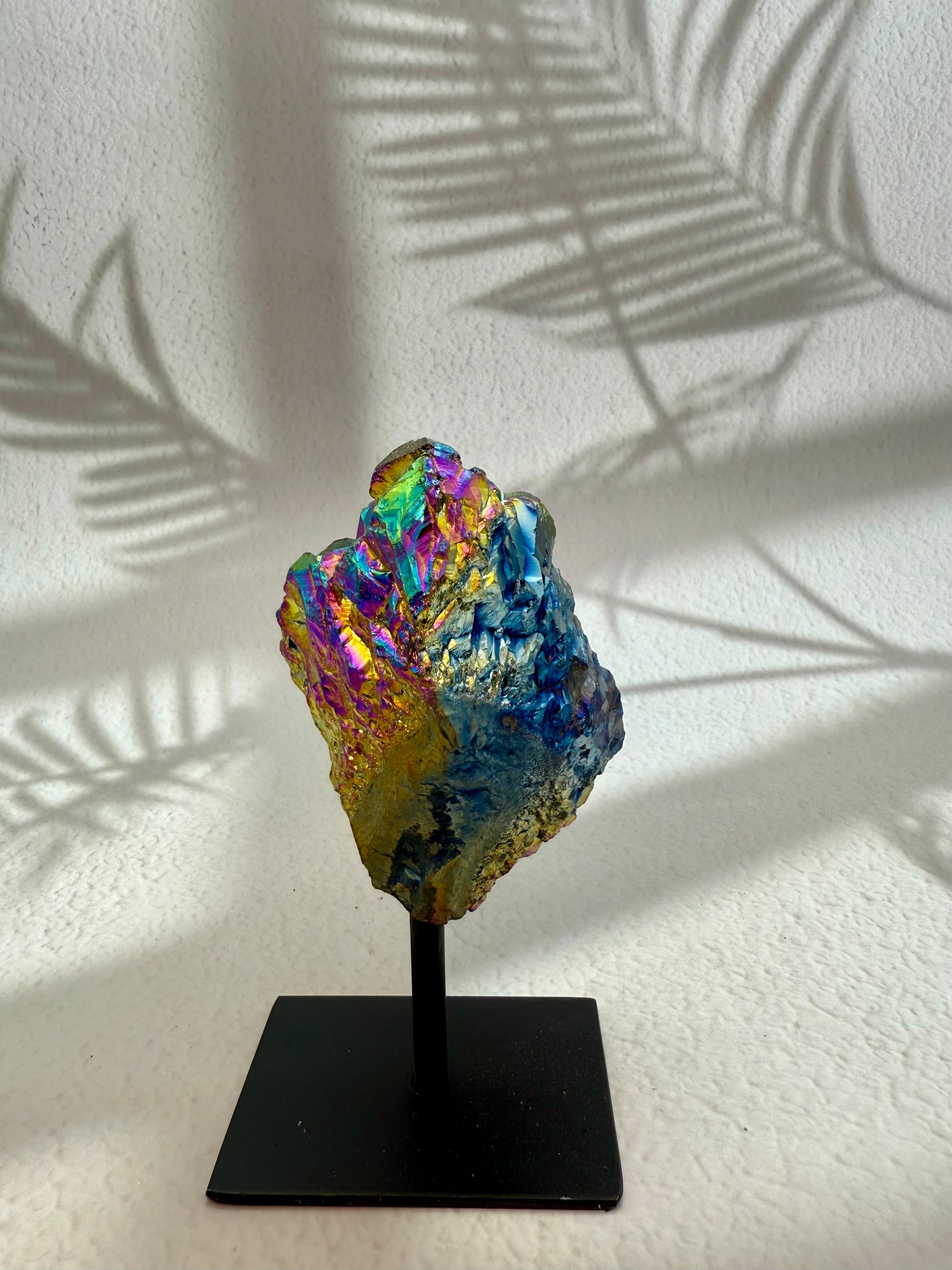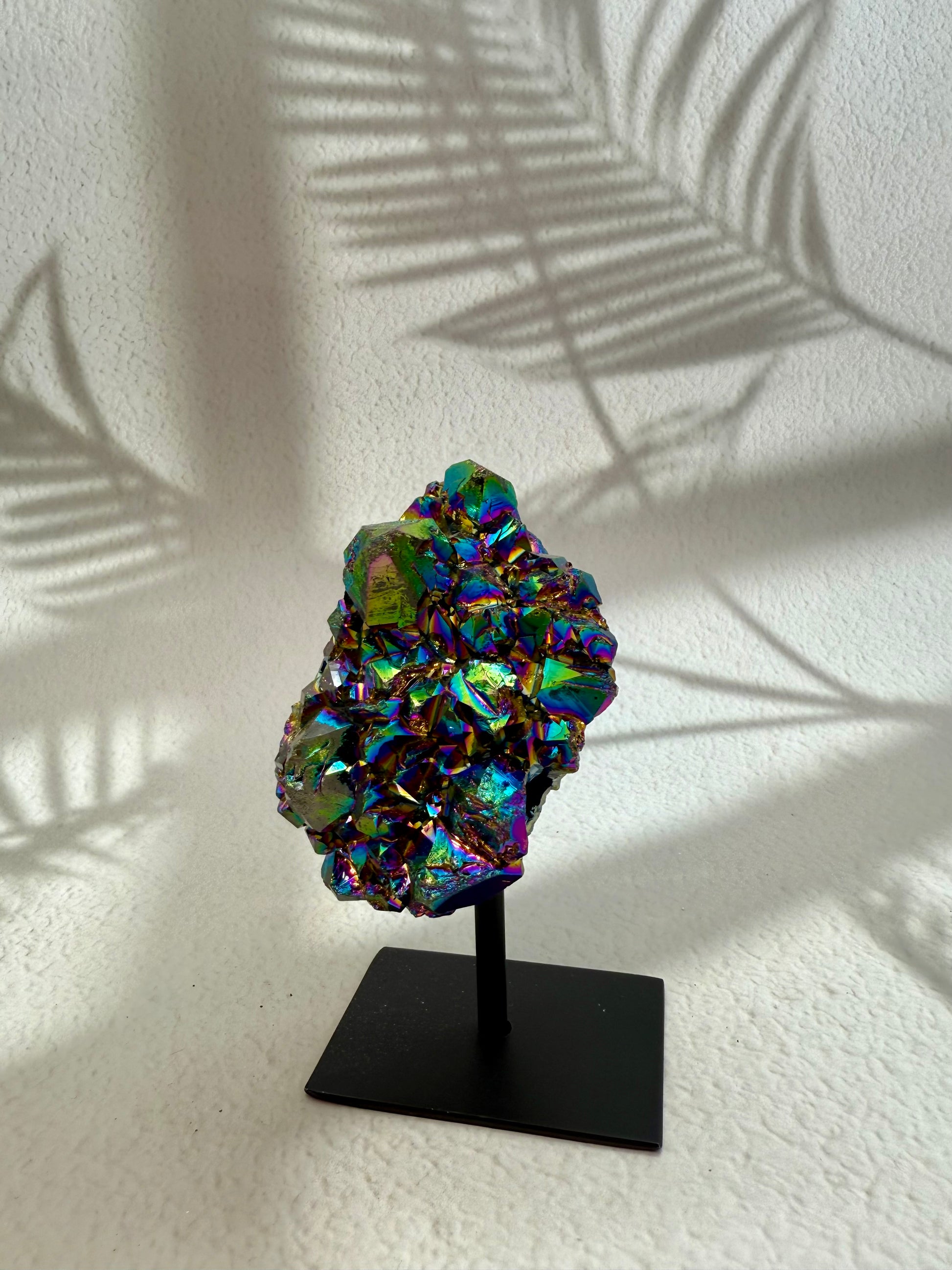 Dieser strahlende Titaniumquarz auf einem eleganten Metallständer vereint natürliche Kristallkraft mit stilvoller Präsentation. Die funkelnden Oberflächen in Blau-, Violett- und Regenbogentönen ziehen alle Blicke auf sich und machen den Quarz zu einem beeindruckenden Blickfang. Auf dem Ständer präsentiert, wird er zu einem dekorativen Highlight und zugleich zu einem kraftvollen Energiespender für dein Zuhause oder deinen Arbeitsplatz.