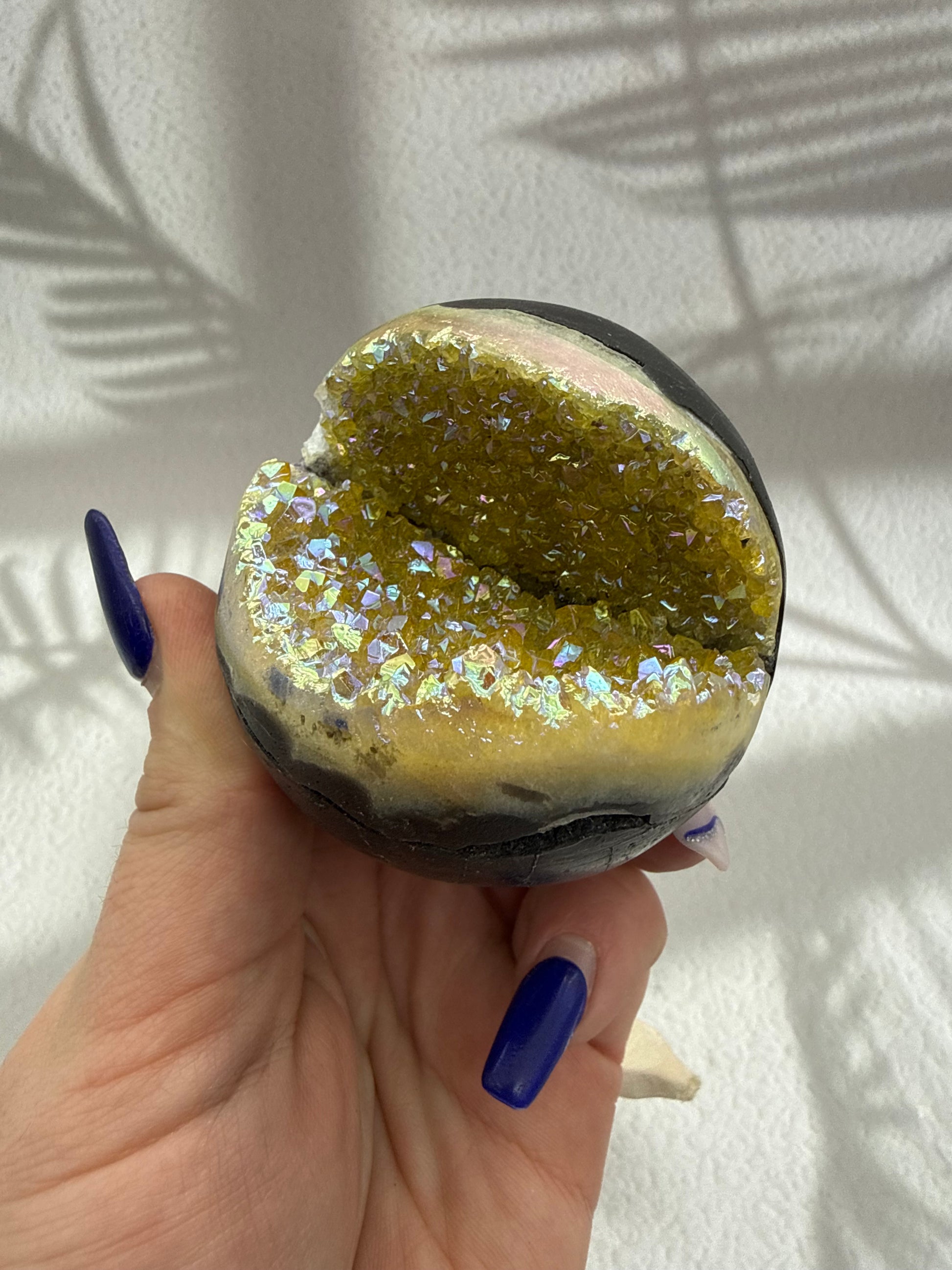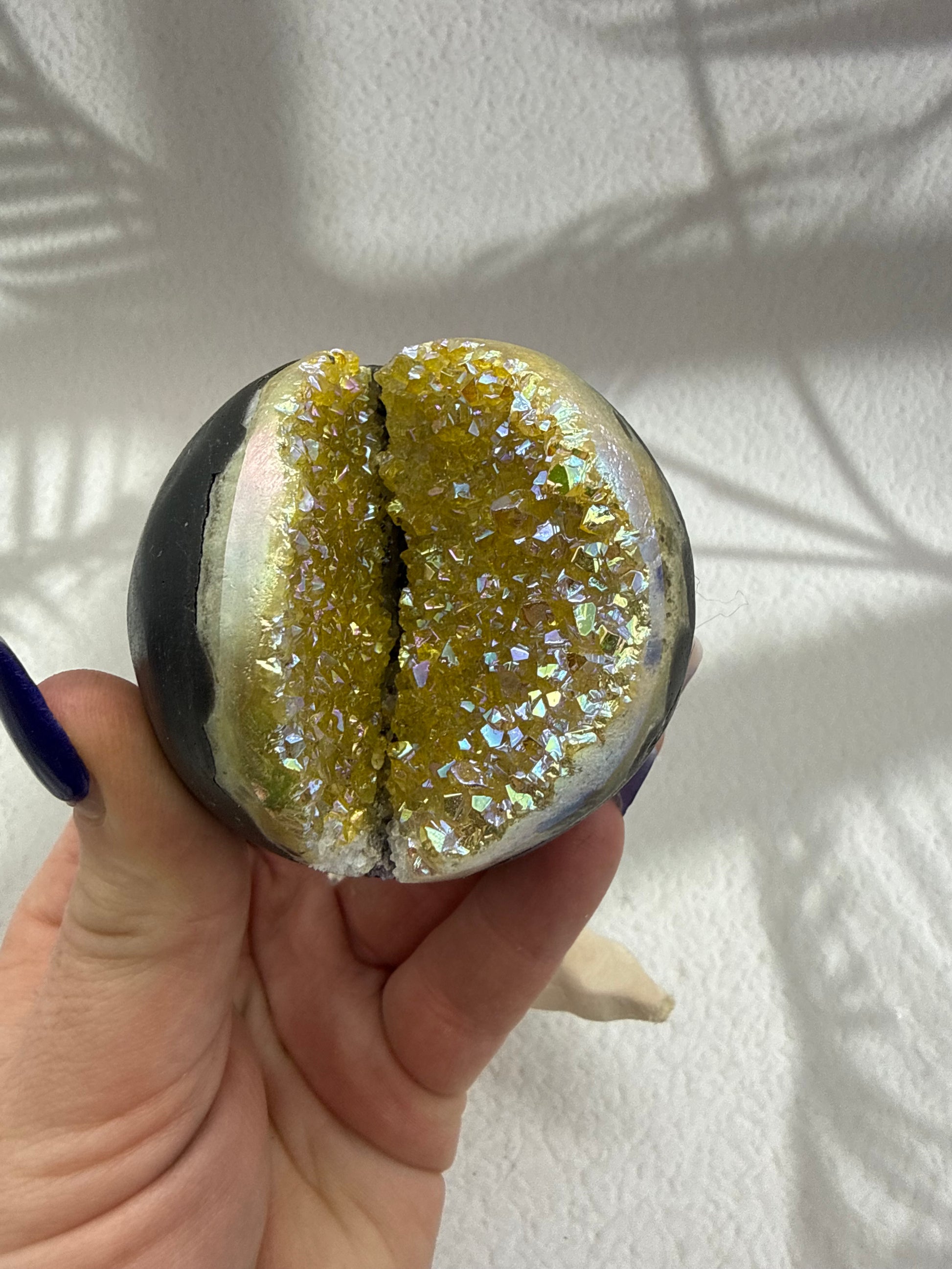 Diese 6,5 cm große Kugel aus Amethyst, bedampft mit Titanium, zeigt ein faszinierendes gelbes Farbspiel. Als B-Ware weist sie sichtbare Risse auf, die jedoch die Stabilität des Steins nicht beeinträchtigen. Die metallisch schimmernden Reflexe bleiben lebendig, sodass die Kugel trotz kleiner Risse ein wunderschöner Hingucker für Wohnraum, Meditationsplatz oder Arbeitsplatz ist.
