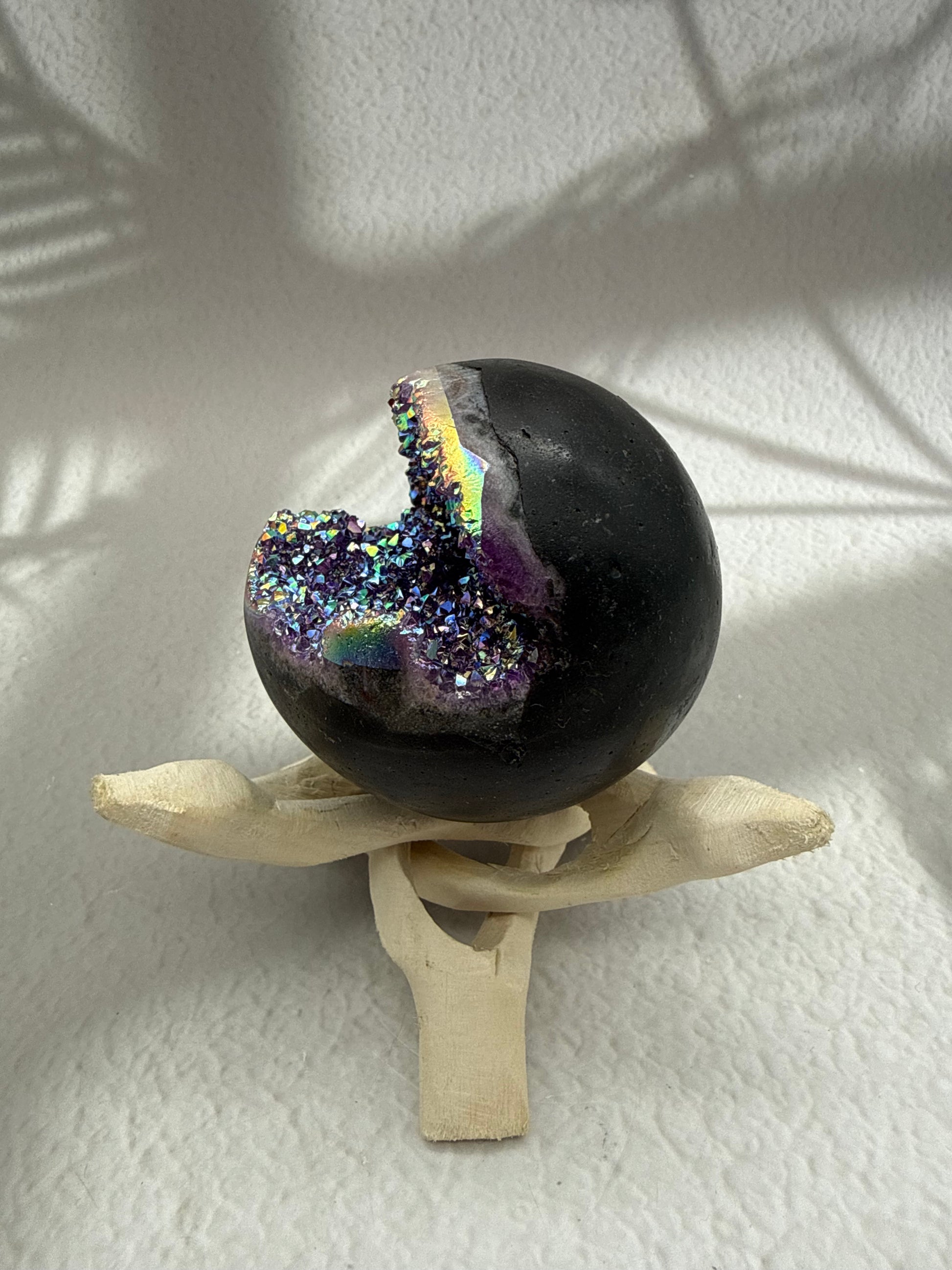 Titaniumquarz ist ein Amethyst, der mit einer hauchdünnen Titanschicht veredelt wurde, um das schillernde Farbspiel zu erzeugen. Er gilt als Stein der Energie, Schutzwirkung und Inspiration. In Kugelform symbolisiert er aufgestiegene, kraftvolle Energie, Klarheit und Harmonie. Das intensive Farbspiel kann dabei helfen, Kreativität zu fördern, innere Balance zu stärken und eine magische, energetisch aufgeladene Atmosphäre zu schaffen.