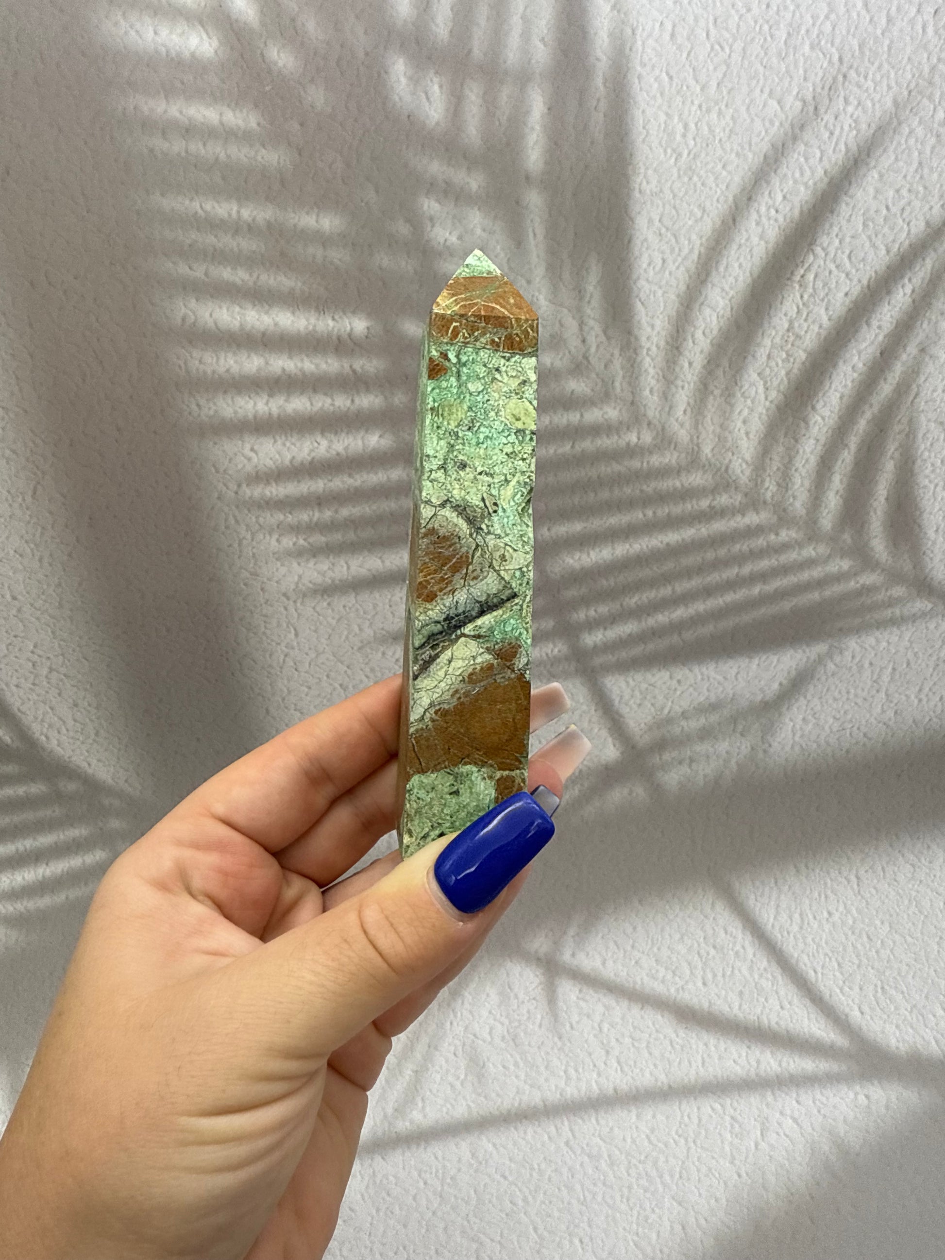 Afrikanischer Türkis – tatsächlich eine Varietät von Jaspis – gilt als „Stein der Evolution“. Er soll innere Stärke fördern, Veränderungen erleichtern und Mut für neue Wege schenken. Die aufrechte Turmform verstärkt diese kraftvolle Energie und symbolisiert Wachstum, Stabilität und Erneuerung. Ideal für Wohnräume, Praxisbereiche oder Meditationsplätze.