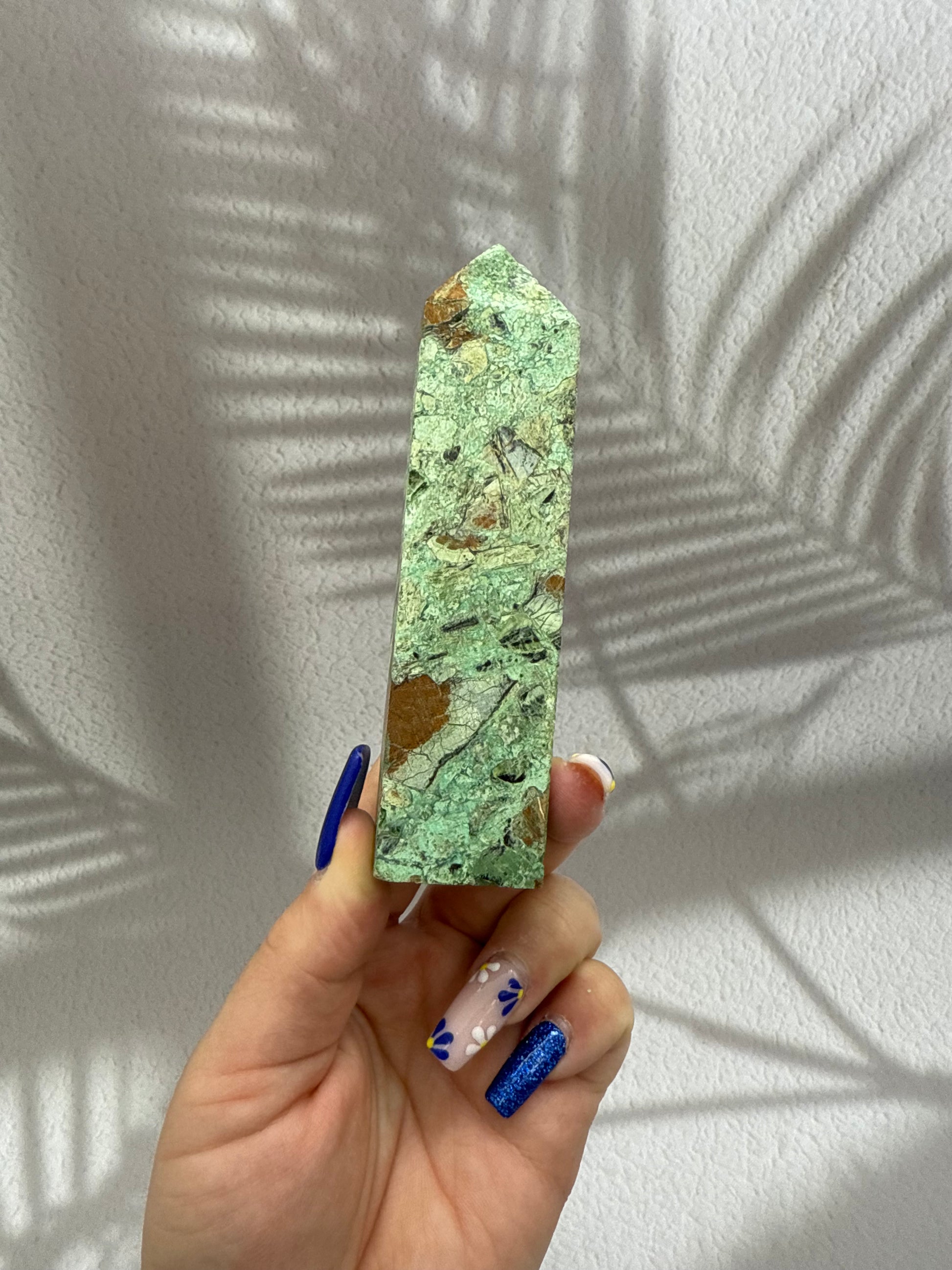 Diese wunderschönen Türme aus afrikanischem Türkis faszinieren mit ihrem einzigartigen Farbspiel aus Türkis-, Grün- und Brauntönen. In Turmform geschliffen, entfaltet der Stein seine Energie besonders stark und wird zu einem dekorativen Highlight mit tiefer symbolischer Bedeutung. Die markanten Maserungen machen jedes Stück zu einem unverwechselbaren Unikat.