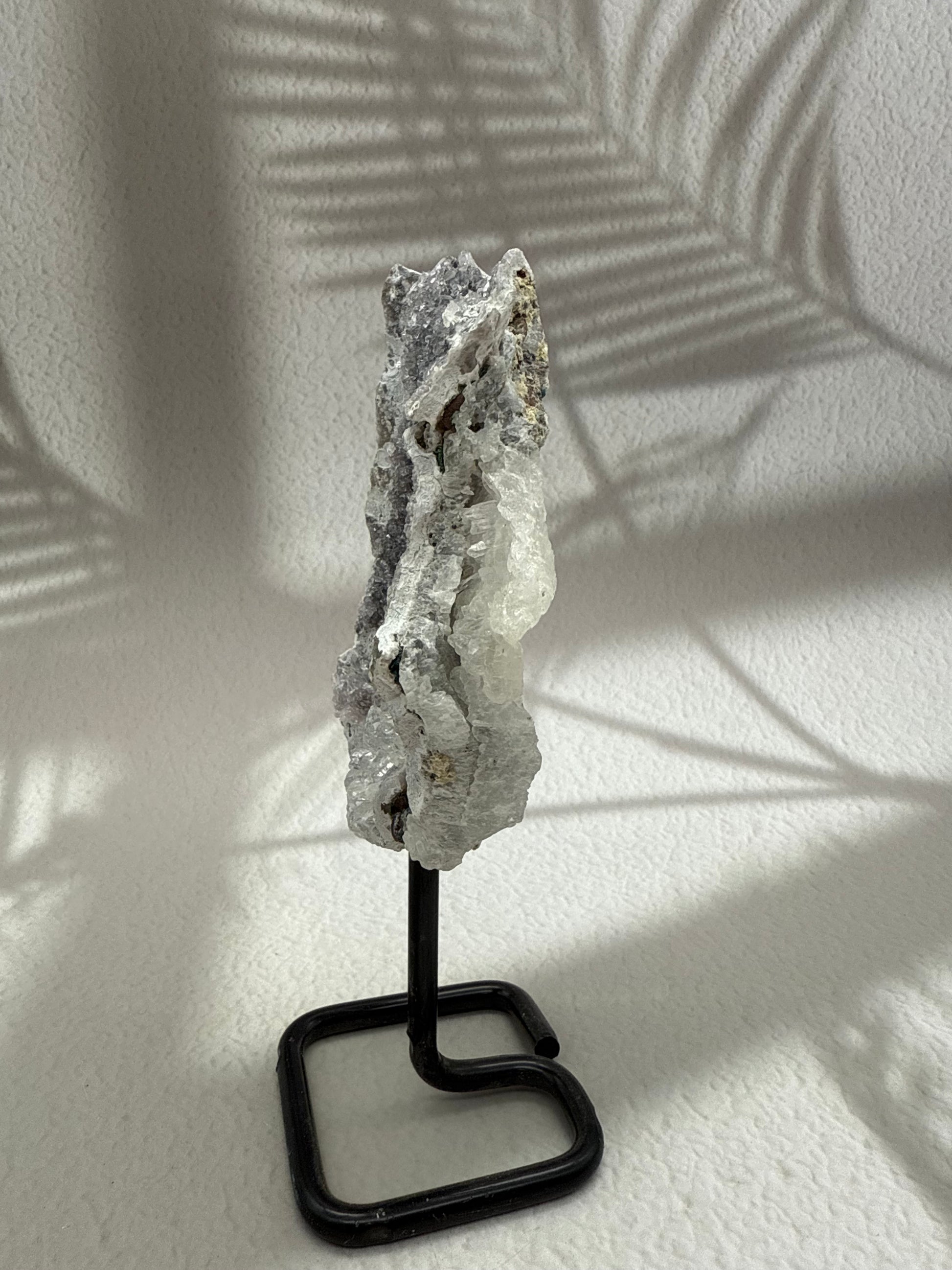 Dieser Zeolith auf einem eleganten Metallständer vereint die zarte, kristalline Struktur des Minerals mit einer stilvollen Präsentation. Sein helles, oft schimmerndes Erscheinungsbild strahlt Leichtigkeit aus und macht ihn zu einem dekorativen Highlight mit tiefer energetischer Wirkung. Auf dem Ständer kommt seine Reinheit besonders gut zur Geltung – ein Blickfang, der Harmonie und Klarheit in jeden Raum bringt.